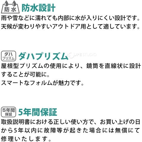 - 新設計接眼レンズでよりシャープな視界にフラットナーレンズを配置した新設計の接眼レンズにより、前シリーズと比較して視界が広がるとともに、視野の周辺部でもシャープな像で観察対象を捉えます。キャンプでの野鳥観察やスターウォッチングに最適です。