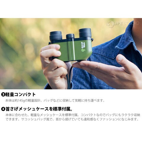 コンパクトな設計で携行性がよく、145gと軽量なため首にかけたまま長時間持ち歩いても苦になりません。サコッシュタイプの小型ケースが付属しているので、双眼鏡を使用しないときはこのケースにさっと収納して持ち運ぶことが可能です。