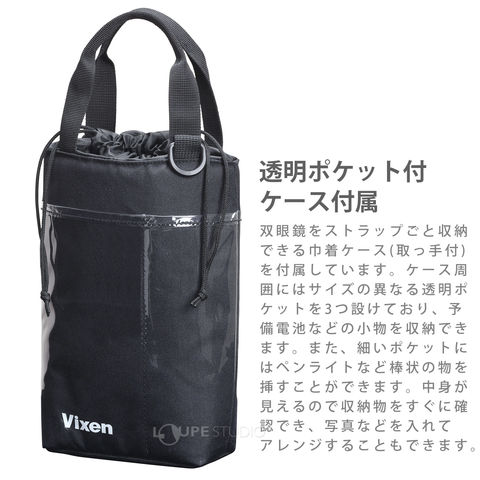 | 付属品 | ソフトケース(ミニトートバッグ)、グリップストラップ(※替え紐 5色付属)、ネックストラップ、接眼キャップ(眼鏡型)、単4形型アルカ リ乾電池×2(モニター電池)、取扱説明書 |