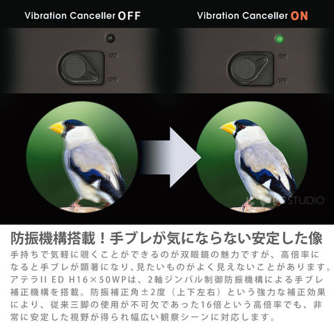 高性能EDレンズを搭載した防振双眼鏡ATERAシリーズの最上位モデル。最上位機種ならではのキレのある緻密な見え味を実現しました。強力な手ブレ補正により、16倍という高倍率ながら手持ちでも安定した視野が得られます。離れたところにある観察対象を、まるですぐそばで見ているような特別な体験をお楽しみいただけます。