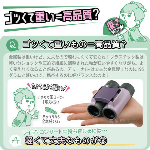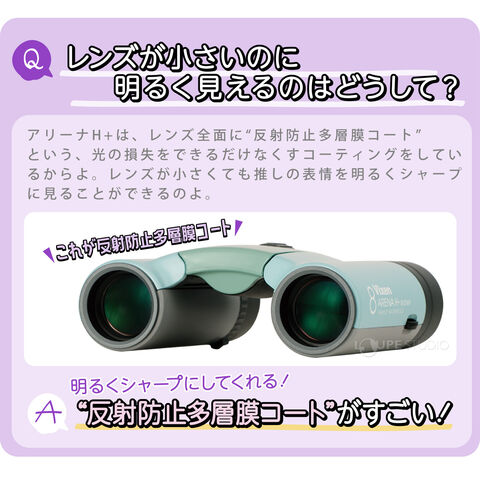 ニュアンスがあり個性も出せるおしゃれなカラーで人気の「アリーナH+」シリーズに、待望の10倍モデル2機種が新登場。キュートなデザインとクリアな視界はそのままに、さらにパワフルな10倍の視界が、遠くのステージにいるアーティストの表情まで鮮明に捉えます。ライブ、コンサートの感動を、もっと大きく。