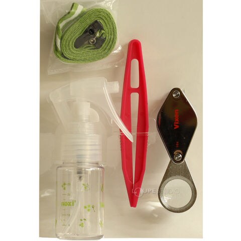 「コケ観察セット」は野山に自生する苔や、庭や盆栽、テラリウムで栽培している苔の観察に便利なアイテムをセットにしています。セット内容は、「ルーペ」、「ポーチ」、「スプレーボトル」、「リボンストラップ」、「コケ観察ガイドブック」、「ピンセット」です。