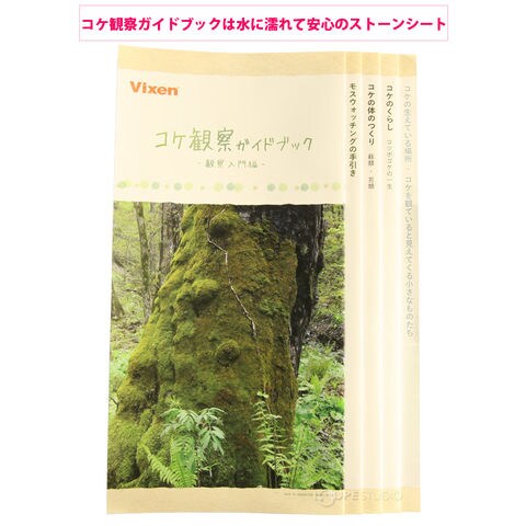 コケ観察ガイドブックは、両面から読みすすめる蛇腹式のガイドブックです。片面は コケ観察の基本「観察入門編」となっており、もう片面は厳選した様々なコケを掲載し、図鑑の様になっています。 観察入門編でははじめてコケを観察する方に向けて、ルーペの使用方法やコケとは どんな生きものなのかを知る事が出来ます。 またコケ観察ガイドブックはストーンシートで出来ているので、水がかかっても、 水辺に落としてしまっても水分で弱って破けることはありません。