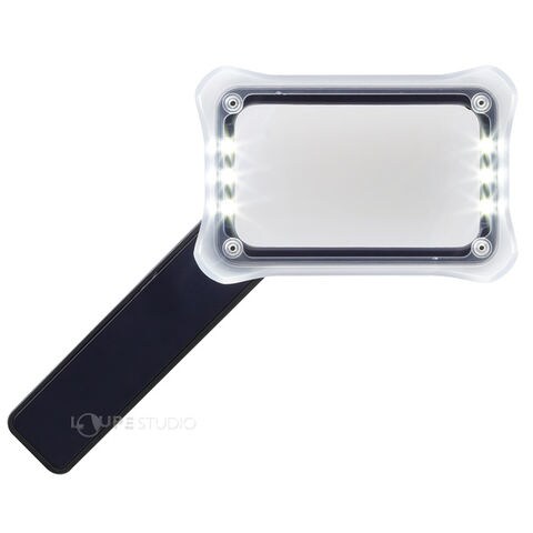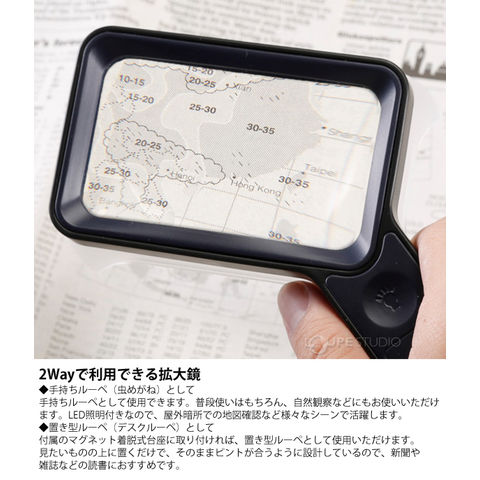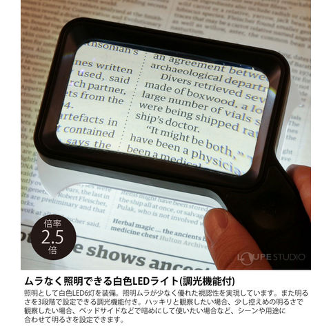 用途に合わせ、手持ち(虫めがね)、置き型の2Wayでお使いただけるルーペです。倍率は、適度な拡大率で見やすい約2.5倍。調光機能が付いた充電式LEDライトを内蔵しており、暗所でも快適に使用いただけます。