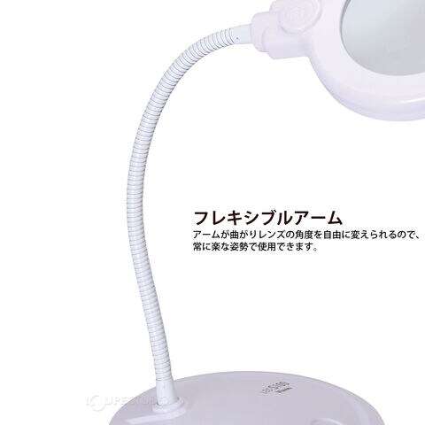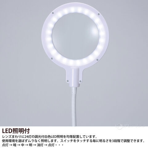 両手を自由に使えるLED照明付スタンド型ルーペです。24灯の調光付白色LED照明を搭載。場所を選ばずムラを抑えた明るい見えが得られます。電源は使用環境に応じて家庭用コンセントAC100V、USB、単三乾電池×4本の3種類から選ぶことができます。
