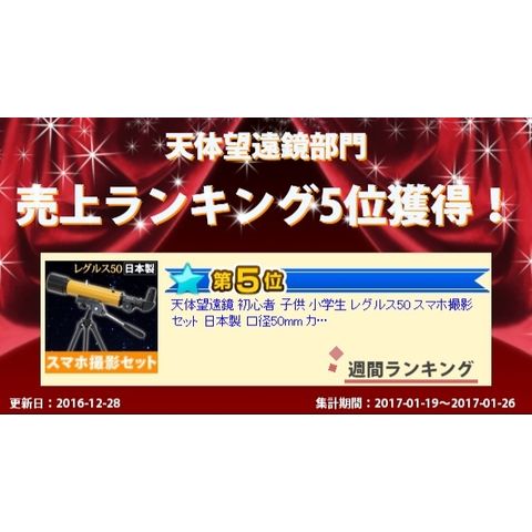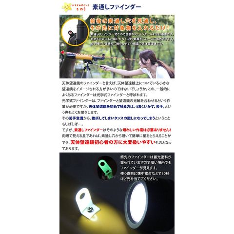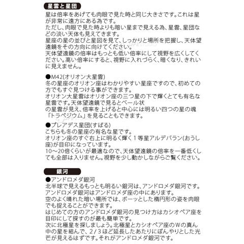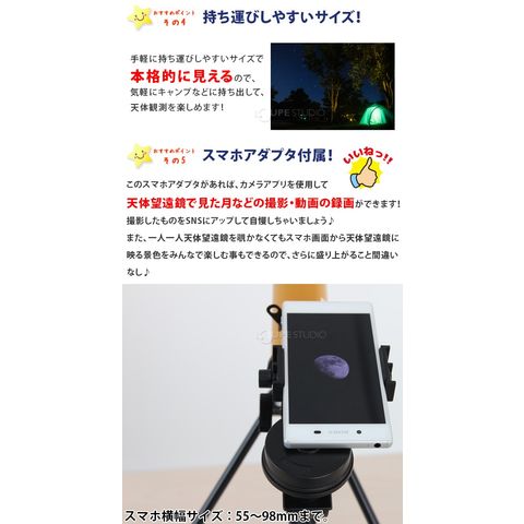 | その他付属品 | 天頂ミラー 三脚 オリジナル天体ガイドブック スマホアダプター【スマホ横幅サイズ:55~98mmまで対応】 | |
