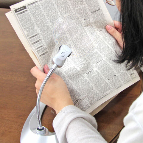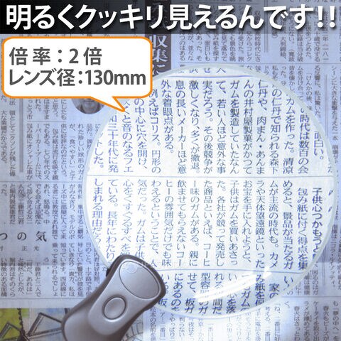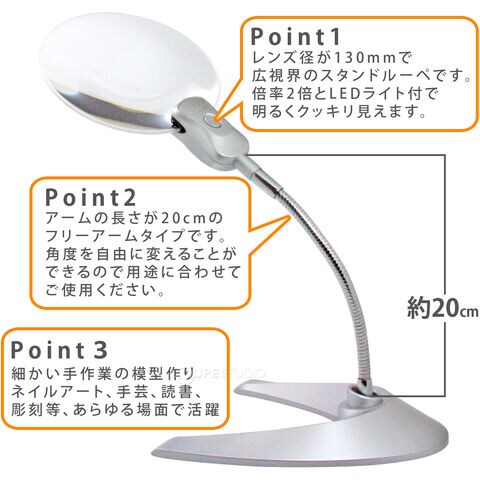 - レンズ径が130mmで広視界のスタンドルーペです。倍率2倍とLEDライト付で明るくクッキリ見えます。