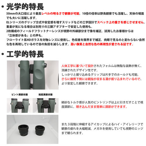 - スワロフスキーの新しいフラッグシップモデルにふさわしい10倍の双眼鏡。およそ1000グラムの重さを感じさせない絶妙なウエイトバランスとラップアラウンド・グリップで疲れを軽減。広い視野の光学設計で高倍率と思えない使いやすさです。