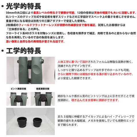 - スワロフスキーの新しいフラッグシップモデルにふさわしい12倍の双眼鏡。およそ1000グラムの重さを感じさせない絶妙なウエイトバランスとラップアラウンド・グリップで疲れを軽減。広い視野の光学設計で高倍率と思えない使いやすさです。