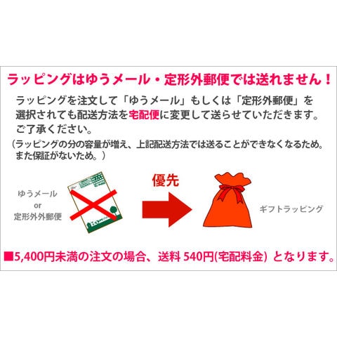 ●ラッピングを注文して配送方法を「メール便」に選択された場合、配送方法を「宅配便」に変更して送料を宅配便料金に変更し、お送りさせていただきます。ご了承ください。