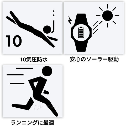 太陽光や蛍光灯などの光を動力に変えるソーラー充電システム「タフソーラー」を搭載したスポーツウオッチです。専用の大型フロントボタンの採用により、操作性にもこだわった120本メモリーのラップ・スプリットタイム機能を装備。更に、天候を気にせず使用可能な10気圧防水機能を搭載しました。