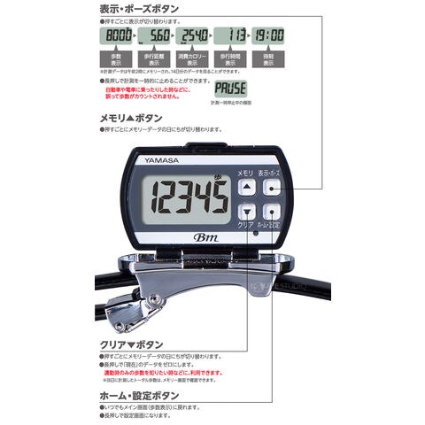 - 歩数・歩行距離・消費カロリー・歩行時間・時刻を表示。14日分のメモリー機能付き