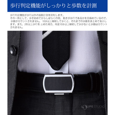 - ベルトのバックルに内蔵された万歩計。外れたり落としたりする心配がありません