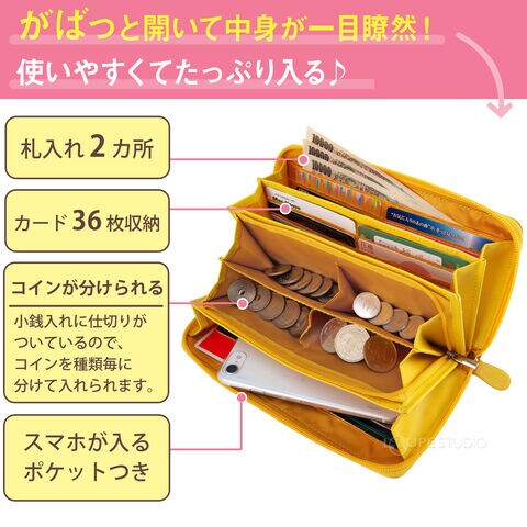 お出かけはこれ1つでOK!スマホも入る大容量が自慢の本革多機能財布です。ガバッと開いて中身が一目瞭然。必要なものがすぐ見つかるのでレジ前でもたつかず、お会計もスマートに済ませられます。小銭入れポケットは4室に分けられているので、コインの種類ごとに仕分けが可能。スヌーピーとウッドストックを連れて楽しい毎日を!
