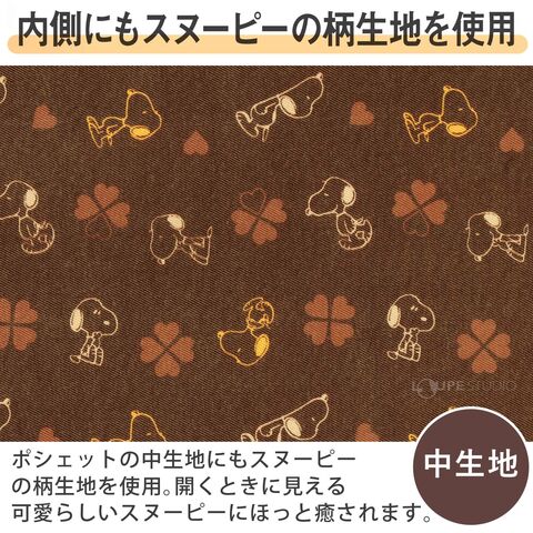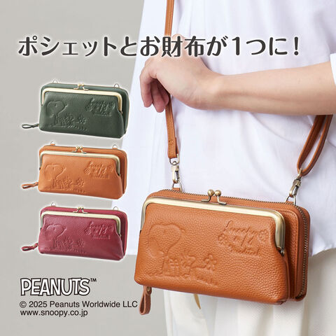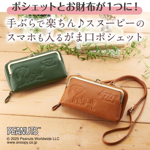 ポシェットとお財布が1つに!充実のお財布機能つきのマルチなポシェットです。ファスナー開閉で見やすく、カードもお札も小銭もしっかり入る実用性。大きめのがま口ポケットにはスマホ収納も可能です!中生地にもスヌーピーの柄生地を使用。開くときに見える可愛らしいスヌーピーにほっと癒されます