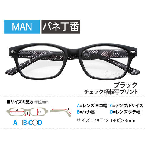 | 仕様 | ブラック チェック柄転写プリント 非球面プラスチックレンズ バネ丁番 |
