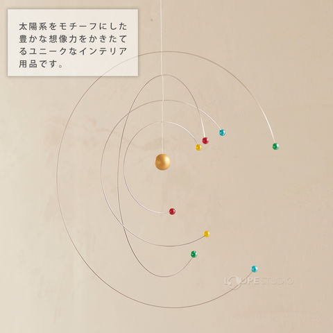 宇宙や科学などに興味のある方はもちろん、お子様の知育オブジェとしてもおすすめのモビール。メタリックな質感が、お部屋をスタイリッシュに彩ります。