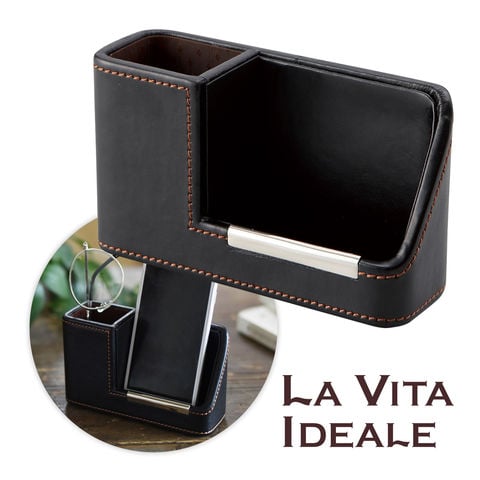 「LA VITA IDEALE」(ラヴィータイデアーレ)とはイタリア語で「理想的な生活」という意味です。日々の生活を有意義に暮らしたいと思う男性をアシストしてくれる小物や収納アイテムを揃えました。デスクの上でもバッグの中でもすんなり馴染むよう、カラーは黒と茶の2色でまとめ、ステッチでカジュアル感をさり気なくプラスしました。年齢を選ばず使えそうな、流行に左右されないシンプルなデザインも魅力。