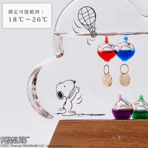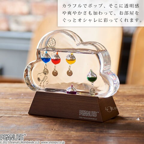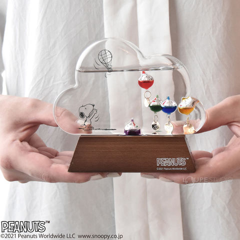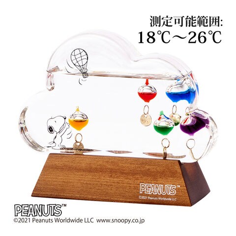 気球を浮かべるスヌーピーが可愛い雲形のガリレオ温度計。カラフルなガラス球が、まるで雲に浮かぶ気球のよう。