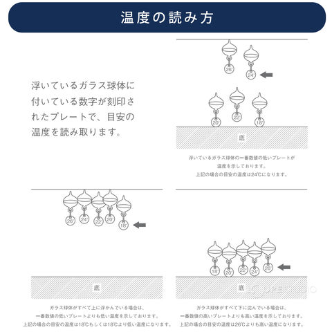 | 備考 | ※差し込み式セットアップ ※測定可能範囲/18℃~26℃ ※ガラス球体5個 ※ベース部素材/天然木(ニレ材) |