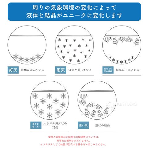 ※商品によって個体差はありますが、室温 およそ5℃~25℃の範囲で結晶化をお楽しみ頂けます。それ以外の室温のもとでは、結晶化はせずに、液体も透明のままです。適切な温度帯になると結晶化するようになります。