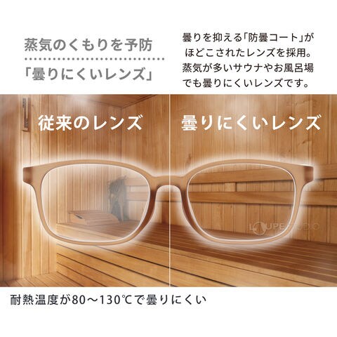 - 曇りを抑える「防曇コート」がほどこされたレンズを採用。蒸気が多いサウナやお風呂場でも曇りにくいレンズです。
