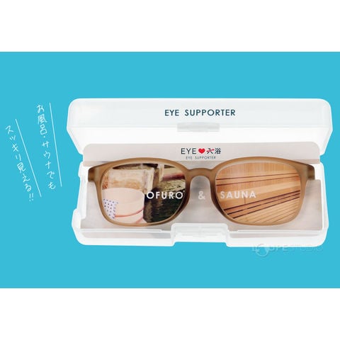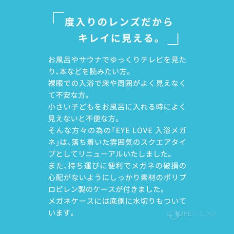 - お風呂やサウナでゆっくりテレビを見たり、本などを読みたい方。小さい子どもをお風呂に入れる時によく見えないと不便な方。そんな方々のための「EYE LOVE 入浴メガネ」は、落ち着いた雰囲気のスクエアタイプとしてリニューアルいたしました。また、持ち運びに便利でメガネの破損の心配がないように、しっかり素材のポリプロピレン製のメガネケースが付きました。メガネケースには底側に水切りもついています。