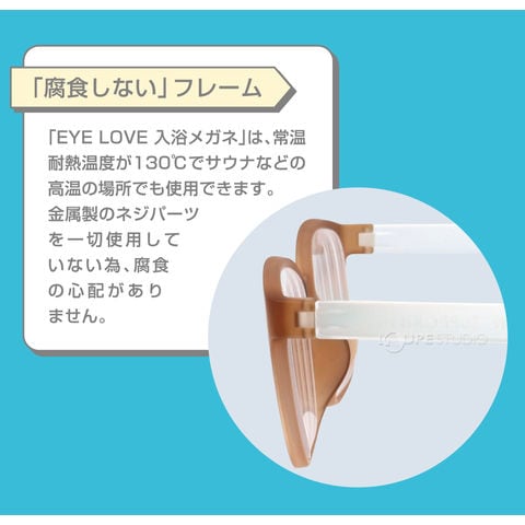- 「EYE LOVE 入浴メガネ」は、常温耐熱温度が130℃でサウナなどの高温の場所でも使用できます。金属製のネジパーツを一切使用していないため、腐食の心配がありません。