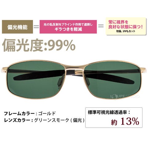 | フレーム/レンズカラー | ゴールド/グリーンスモーク(偏光) ガンメタル/スモーク(偏光) |