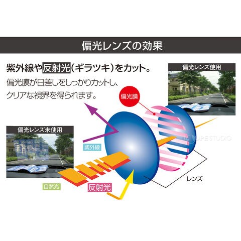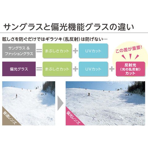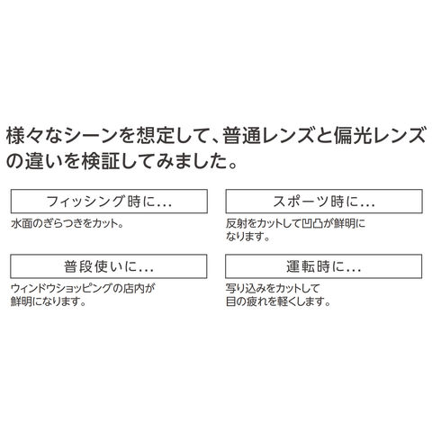 アクティブ・スポーツシーンに最適。UVカット、まぶしさカット、ギラツキカットの偏光効果を発揮します。