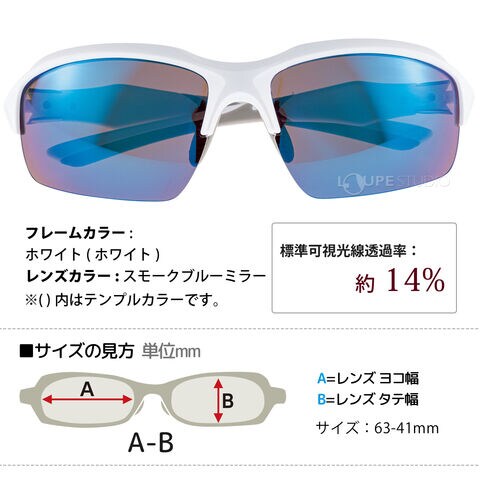 | フレーム/レンズカラー | ブラック(ブラック)/スモーク マットブラック(マットブラック)/スモークシルバーミラー ホワイト(ホワイト)/スモークブルーミラー ※()内はテンプルカラーです。 |