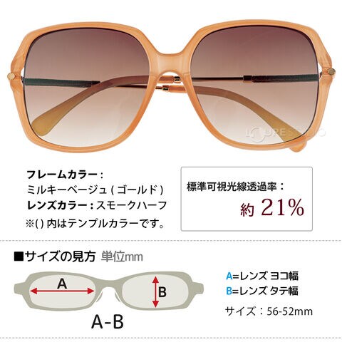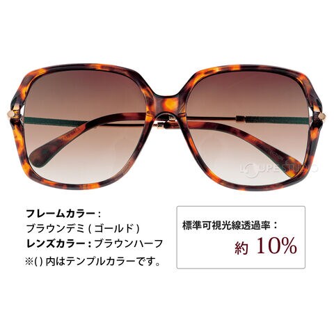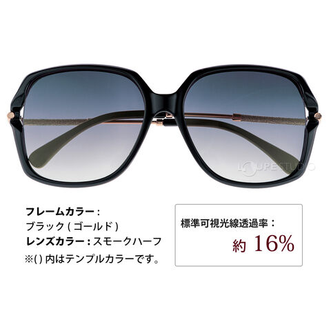| フレーム/レンズカラー | ブラック(ゴールド)/スモークハーフ ブラウンデミ(ゴールド)/ブラウンハーフ ミルキーベージュ(ゴールド)/スモークハーフ ※()内はテンプルカラーです。 |