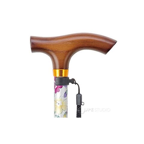 主張しすぎない、除品な花柄を採用。安全で便利なストラップ付き。高級家具調の木製グリップで存在感をアピール。先ゴムは、吸盤タイプで、滑りにくくシッカリと地面に密着します。