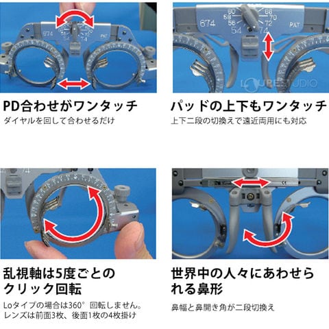 | 特徴 | PD54~74/ワンタッチダイヤル 乱視軸/5度毎に調節 鼻パット/開きと高さの調節可能 テンプル/長さの調節可能 前傾角/ダイヤルで調節可能 レンズ数/前面3枚、後面1枚 |