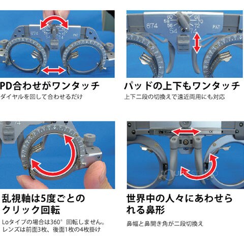 | 特徴 | PD48~60 ワンタッチダイヤル 乱視軸/5度毎に調節 鼻パット/開きと高さの調節可能 テンプル/長さの調節可能 前傾角/ダイヤルで調節可能 検眼レンズ 4枚装着 |