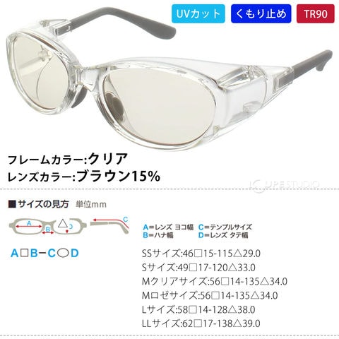 | M(クリア)サイズ | 使用目安/男性・女性 レンズ横幅56□鼻幅14-テンプル135△レンズ縦幅34.0mm 重量/本体28g 外寸142mm 内寸127mm 奥行155mm レンズカーブ/6カーブ |