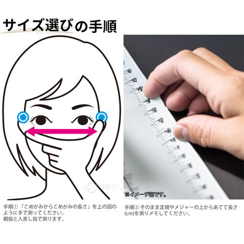 | 注意 | ※サイズの選び方を参考に、お顔の横幅の長さを計測してからサイズをお選びください。お顔の形状には個人差がありますので、サイズの表記はあくまでも目安になります。 |