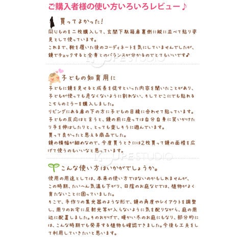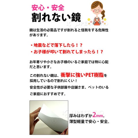 | 注意 | ※樹脂製の鏡はガラス製の鏡ほどクリアに映りませんが、割れないので安全です。 歪みにくい距離がありますのでなるべく近づいてご覧ください。 |