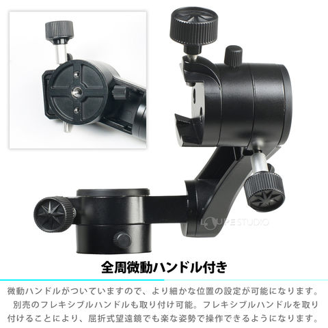 MOEBIUS シリーズ第一弾として、MOEBIUS M-M5経緯台をご用意しました。初心者にも扱いやすい経緯台はフリーストップ式で、見たい位置で手を放せばそこで止まってくれるので、簡単に対象物に向けることができます。また微動ハンドルもついているのでスムーズな微動が行え、より細かな位置の設定が可能です。鏡筒の取り付けは互換性の高い45mm幅のアリミゾ式を採用していますので、ネジ1本で簡単に鏡筒の着脱が可能。45mm幅のアリ型採用の鏡筒であれば、他の鏡筒も簡単に着脱できます。