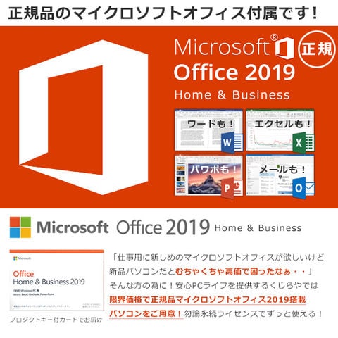 正規品のマイクロソフトオフィスの 2019 Home&Businessです。 ワード、エクセル、パワーポイント、アウトルックが使用可能です。 |