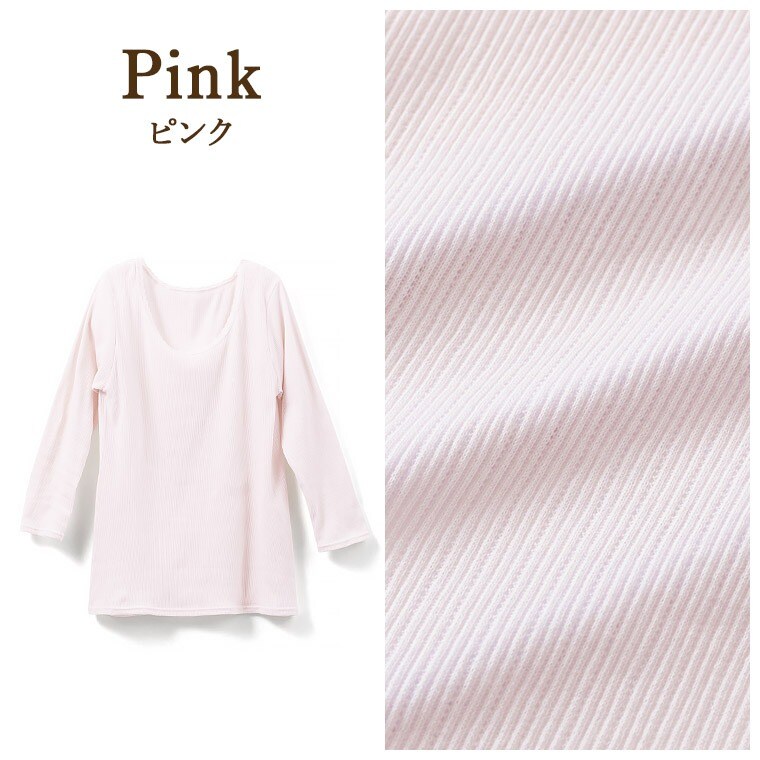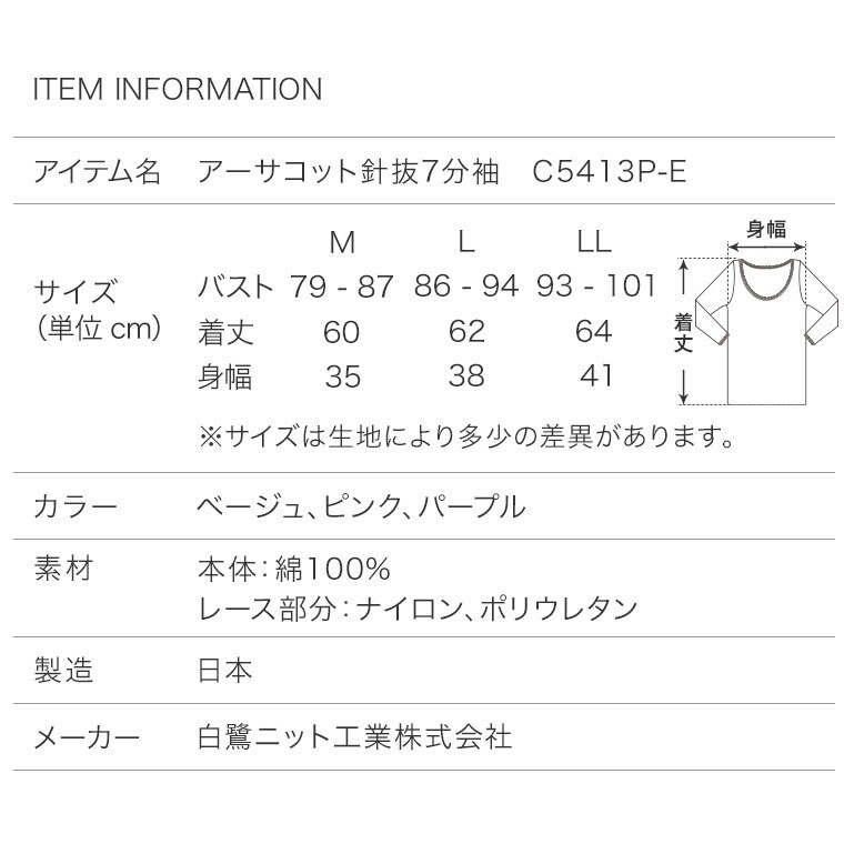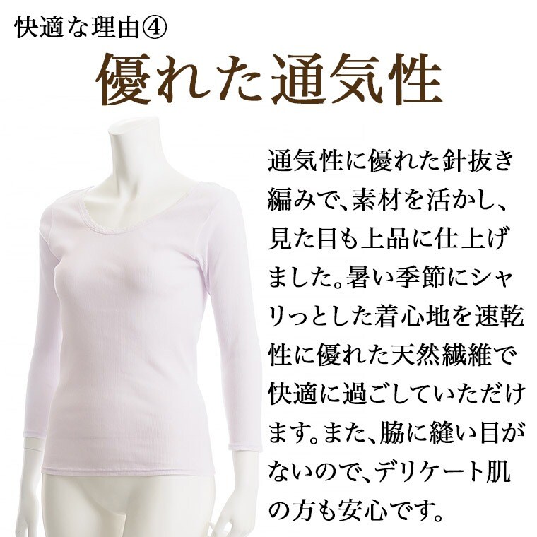 レディース インナー 綿 100% 吸水 速乾 7分袖 日本製 春夏 通気 性 シャリ感 お肌に優しい レース付き 国産 婦人 女性 下着 肌着 ベージュ/ピンク/パープル M/L/LL C5413P-E 涼しい