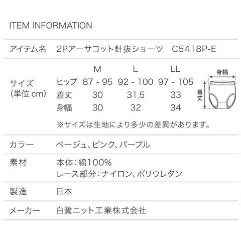 【スペック】 アイテム名:2Pアーサコット針抜ショーツ C5418P-E サイズ: M / L / LL ヒップ:87-95 / 92-100 / 97-105 着丈:30 / 31.5 / 33 身幅:30 / 32 /34 ※サイズは生地により多少の差異があります。 素材:(本体)綿100% (レース)ナイロン、ポリウレタン 製造:日本製 綿 100% 吸水 速乾 ショーツ 2枚組 春夏 レディース 通気 性 シャリ感 スタンダード パンツ パンティー お肌に優しい レース付き 国産 締め付けない 深め 深ばき 婦人 女性 下着 肌着 ベージュ/ピンク/パープル M/L/LL C5418P-E