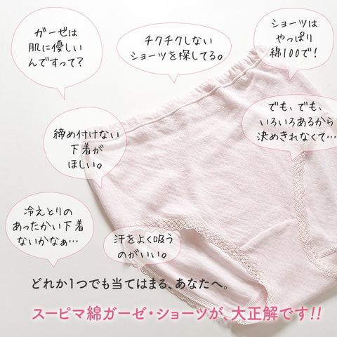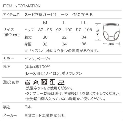 【スペック】 アイテム名: スーピマ綿ガーゼショーツ G5020B-R サイズ: M / L / LL ヒップ: 87-95 / 92-100 / 97-105 着丈:30 / 32 / 34 身幅: 32 / 34 / 36 ※サイズは生地により多少の差異があります。 素材:(本体)綿100% (レース部分)ナイロン、ポリウレタン 製造:日本 綿ガーゼ ショーツ スーピマ 綿 100% レディース インナー スタンダード パンツ 敏感肌 肌に優しい コットン 冷えとり あったか レース 締め付けない 深め 深ばき 婦人 女性 下着 肌着 ギフト 白鷺ニット ピンク ベージュ M L LL G5020B-R