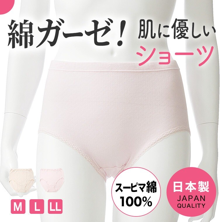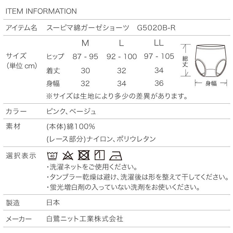 【スペック】 アイテム名: スーピマ綿ガーゼショーツ G5020B-R サイズ: M / L / LL ヒップ: 87-95 / 92-100 / 97-105 着丈:30 / 32 / 34 身幅: 32 / 34 / 36 ※サイズは生地により多少の差異があります。 素材:(本体)綿100% (レース部分)ナイロン、ポリウレタン 製造:日本 綿ガーゼ ショーツ スーピマ 綿 100% レディース インナー スタンダード パンツ 敏感肌 肌に優しい コットン 冷えとり あったか レース 締め付けない 深め 深ばき 婦人 女性 下着 肌着 ギフト 白鷺ニット ピンク ベージュ M L LL G5020B-R