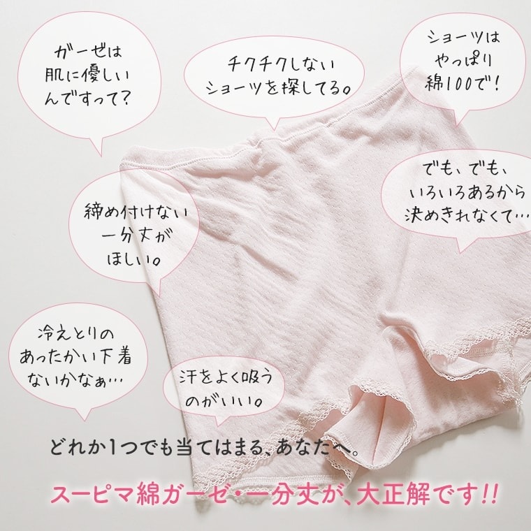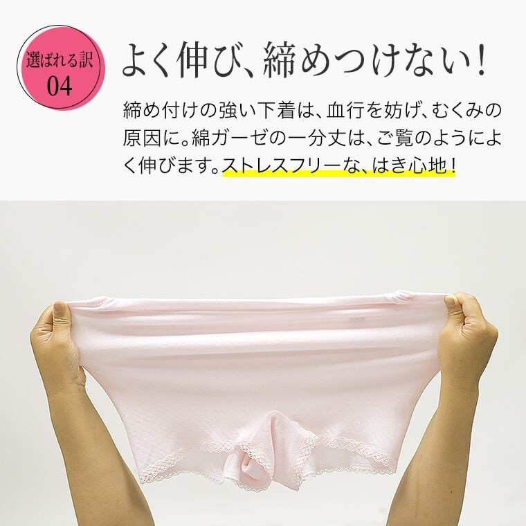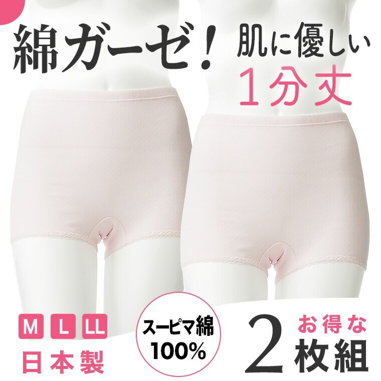 【スペック】 アイテム名: スーピマ綿ガーゼ1分丈ショーツ2枚組 G5026B-R サイズ: M / L / LL ヒップ: 87-95 / 92-100 / 97-105 着丈:30 / 32 / 34 身幅: 32 / 34 / 36 ※サイズは生地により多少の差異があります。 素材:(本体)綿100% (レース部分)ナイロン、ポリウレタン 製造:日本 お得な2枚セット 綿ガーゼ 一分丈 ボクサー ショーツ スーピマ 綿 100% レディース インナー ボックス ショーツ パンツ 敏感肌 肌に優しい コットン 冷えとり あったか 締め付けない レース 深め 深ばき 婦人 女性 下着 肌着 ギフト 日本製 白鷺ニット ピンク ベージュ M L LL G5026B-R
