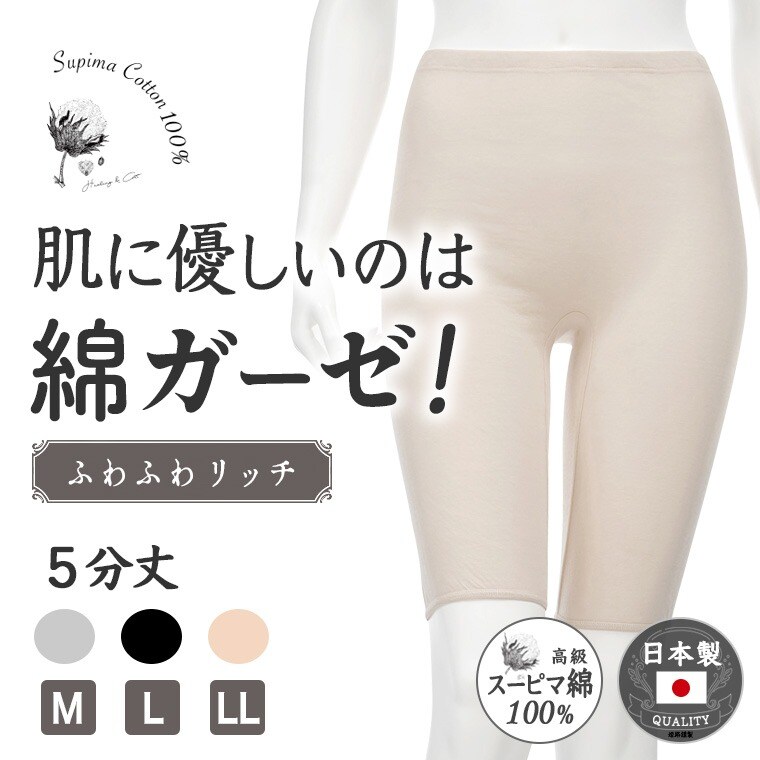 【スペック】 アイテム名: スーピマ綿ガーゼ5分丈 G5055N-RT サイズ: M / L / LL ヒップ:87-95 / 92-100 / 97-105 着丈:50 / 53 / 56 股下:26.5 / 28 / 29.5 身幅:30 / 32 / 34 ※サイズは生地により多少の差異があります。 素材:(本体)綿100% (裾部分)ナイロン67%綿23%ポリウレタン10% 製造:日本 綿ガーゼ インナー 5分丈 シンプル レディース 年間 スーピマ 綿 100 % レギンス スパッツ ズボン下 スラックス下 ズロース スラ下 敏感肌 コットン 100 おしゃれ 締め付けない あったか 冷えとり 膝上 高級 ブラック/ベージュ/グレー M/L/LL G5055N-RT