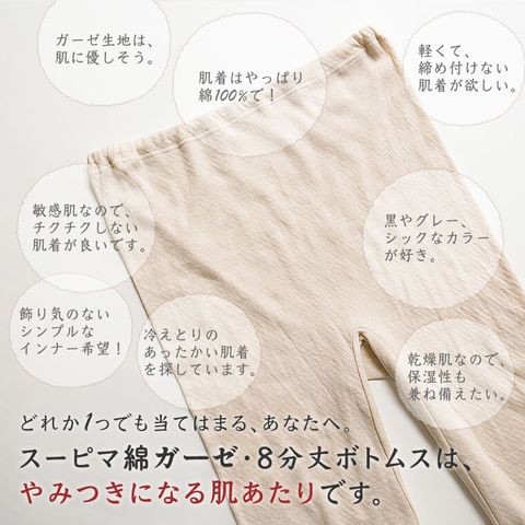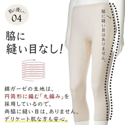 【スペック】 アイテム名: スーピマ綿ガーゼ8分丈 G5056N-RT サイズ: M / L / LL ヒップ:87-95 / 92-100 / 97-105 着丈:80 / 83 / 86 股下:56.5 / 58 / 59.5 身幅:30 / 32 / 34 ※サイズは生地により多少の差異があります。 素材:(本体)綿100% (裾部分)ナイロン67%綿23%ポリウレタン10% 製造:日本 綿ガーゼ インナー 8分丈 シンプル レディース 年間 スーピマ 綿 100 % レギンス スパッツ ズボン下 スラックス下 ズロース スラ下 敏感肌 コットン 100 おしゃれ 締め付けない あったか 冷えとり 膝下 高級 ブラック/ベージュ/グレー M/L/LL G5056N-RT