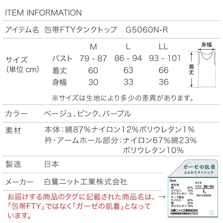 レディース インナー 包帯 のように 優しい タンクトップ 日本製 年間 締め付けない 保湿 通気 性 フィット 伸縮性 消臭 綿混 ノースリーブ 婦人 女性 下着 肌着 ピンク/ベージュ/パープル M/L/LL G5060N-R
