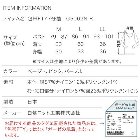 レディース インナー 長袖 包帯 のように 優しい 7分袖 日本製 締め付けない 保湿 通気 性 年間 フィット 伸縮性 消臭 綿混 婦人 女性 下着 肌着 ピンク/ベージュ/パープル M/L/LL G5062N-R