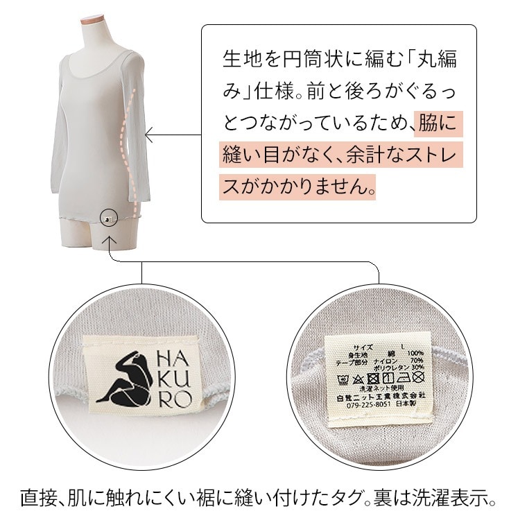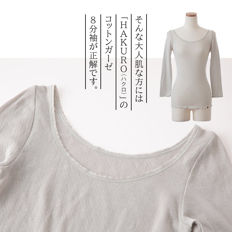 レディース インナー シャツ 長袖 HAKURO 綿100% 8分袖 日本製 コットン ガーゼ 日本製 年間 肌着 下着 G9212X-HKR